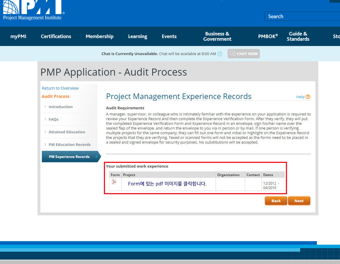 5. Education Records(35시간 프로젝트 관리 교육 이수)를 확인하고 'Next'버튼을 클릭합니다. (영문 수료증 사본 준비)