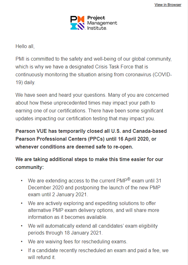 신종 코로나바이러스 감염증(코로나19)으로 펜데믹(세계적 대유행)이 선언된 이후 많은 변화가 PMI 협회의 자격증 인증 시험까지 미치는 것 같습니다.