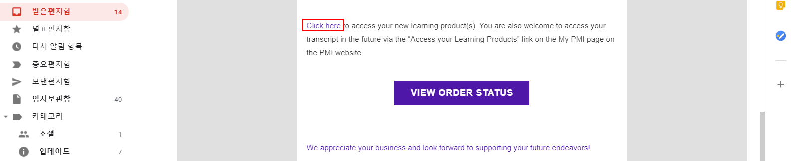 7. pmi.org에 입력된 이메일로 'Project Management for Beginners' 주문정보가 온다. 이메일에서 하단에 Click here를 클릭하면 하단의 Trainning 사이트 홈으로 이동한다.