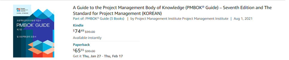 PMBOK GUIDE 7판 같은 책인데, 한국어 버전은 영어버전 대비해서 $37.49 더 비싸다.
