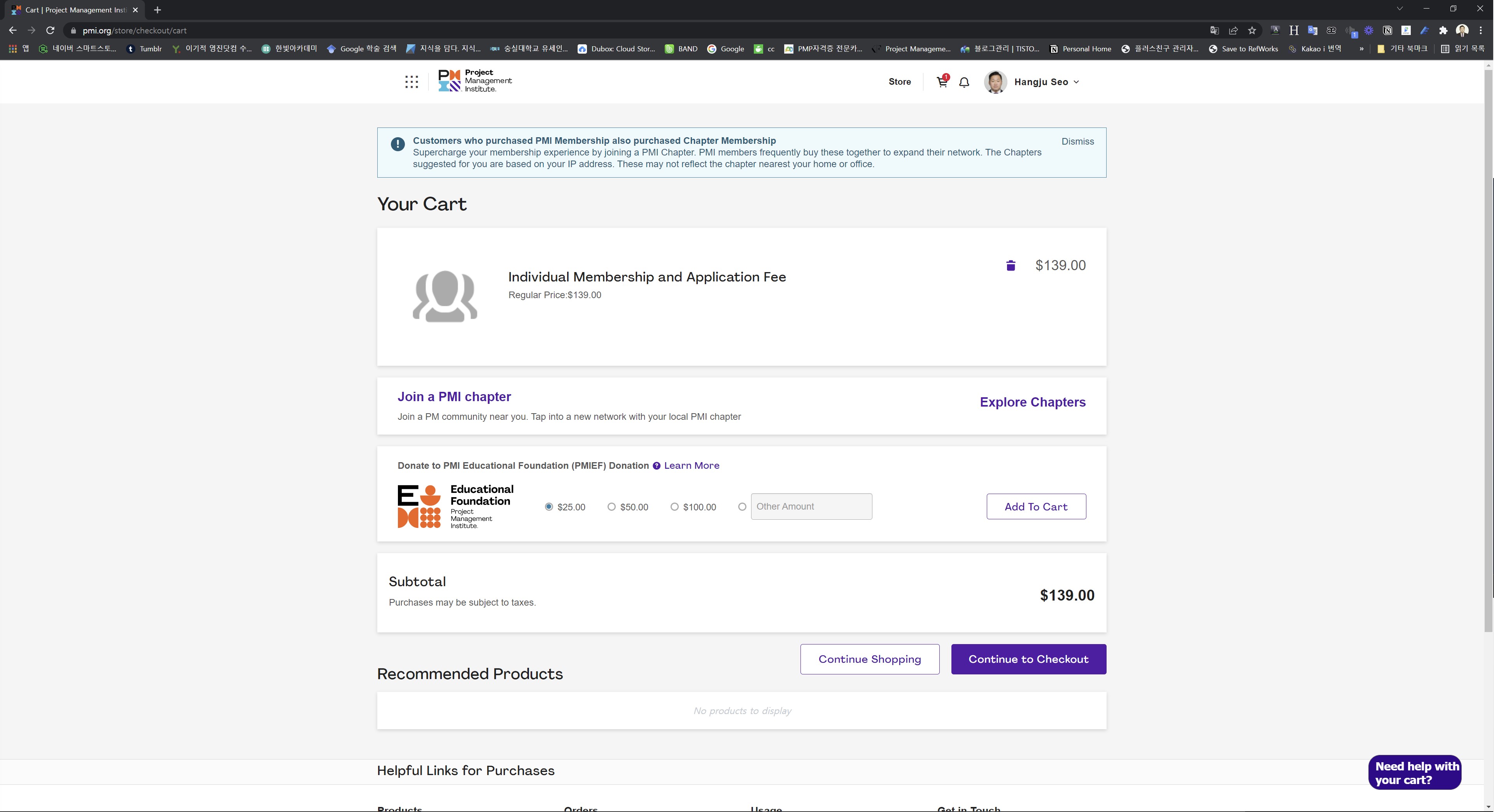 4. Your Cart 부분으로 넘어가면 자동으로 Individual Membership and Application Fee와 South Korea Chapter의 두 개의 비용을 결제하도록 PMI협회가 설정을 해놓았다.(South Korea Chapter $33 비용 삭제 후 진행)