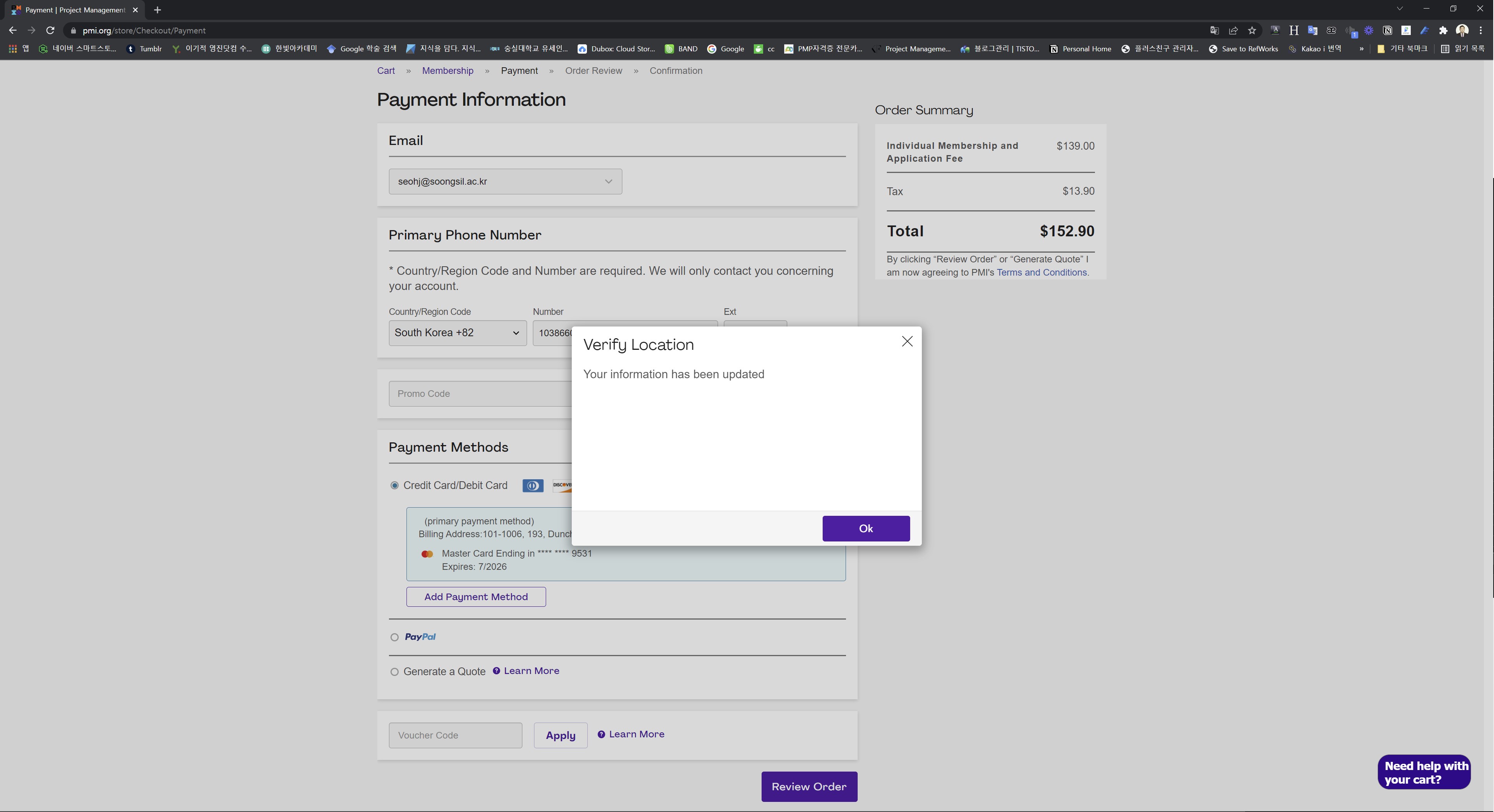 - PMP 자격증 시험을 준비하시는 분들 중에서 가끔 PMI협회 유료 멤버십 가입비로 $172을 결제했는데 South Korea Chapter 비용을 취소하는 방법에 대한 문의들이 있어, PMI협회 아시아고객센터 담당자에게 이 부분을 선택사항으로 처음부터 결제해야 하는 착각이 없도록 수정해 달라고 요청했으나 묵묵부답이다.