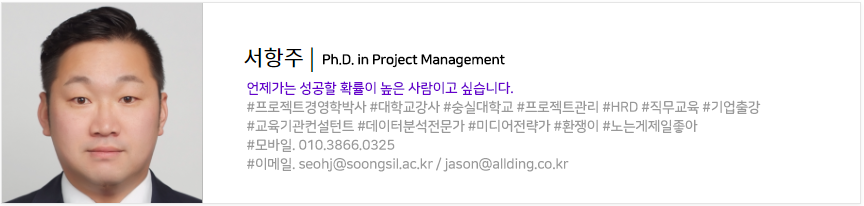 2006년 PM분야 교육 운영 담당자로 시작하여 16년이나 지나고 보니 프로젝트경영학 석·박사 학위를 취득하게 되었습니다. 가장 오랜 시간 동안 관심을 가져온 Project Management 분야 커뮤니티가 전문가들의 만남의 장이 되기를 희망해 봅니다.