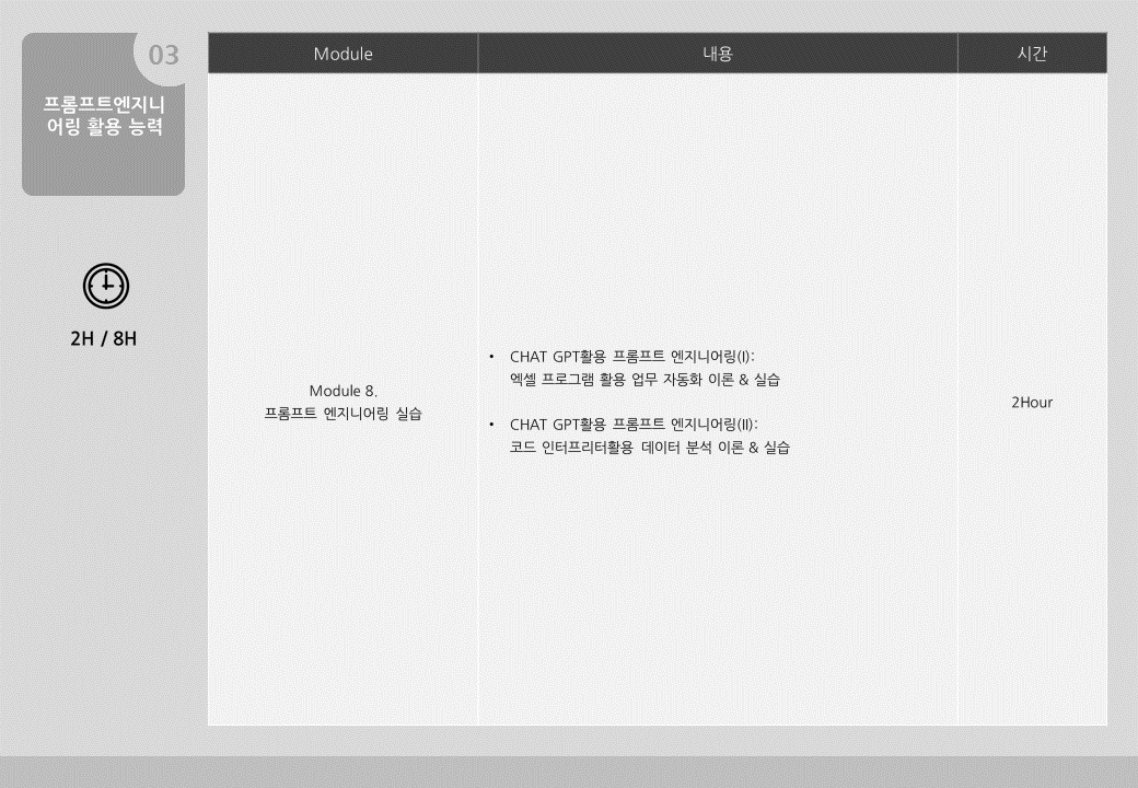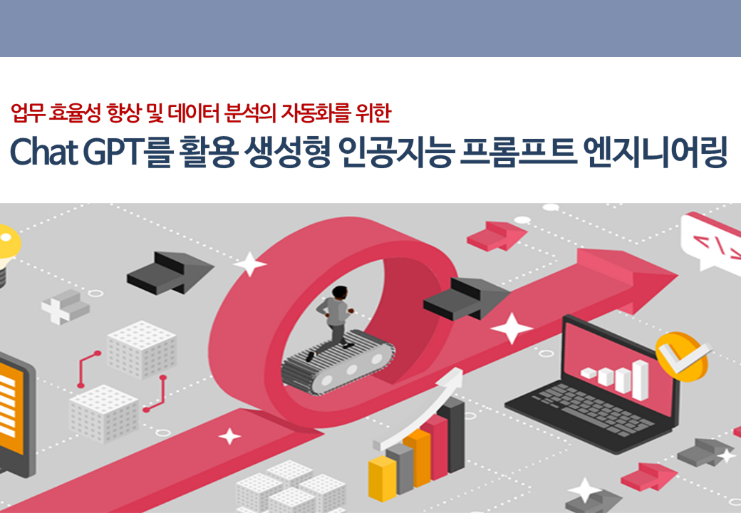 프롬프트 엔지니어링은 생성된 AI 모델이 원하는 출력을 생성하도록 안내하는 프롬프트를 설계하고 제작하는 프로세스로 프롬프트 엔지니어링을 활용하여 일상 업무 및 업무 관련 업무를 개선하는 방법을 학습합니다. 또한 ChatGPT, Google Bard 및 Microsoft Bing Chat과 같은 생성 AI 챗봇을 사용하는 방법을 살펴보고 엑셀 프로그램 활용 업무 자동화, 코드 인터프리터활용 데이터 분석을 실습을 진행합니다.