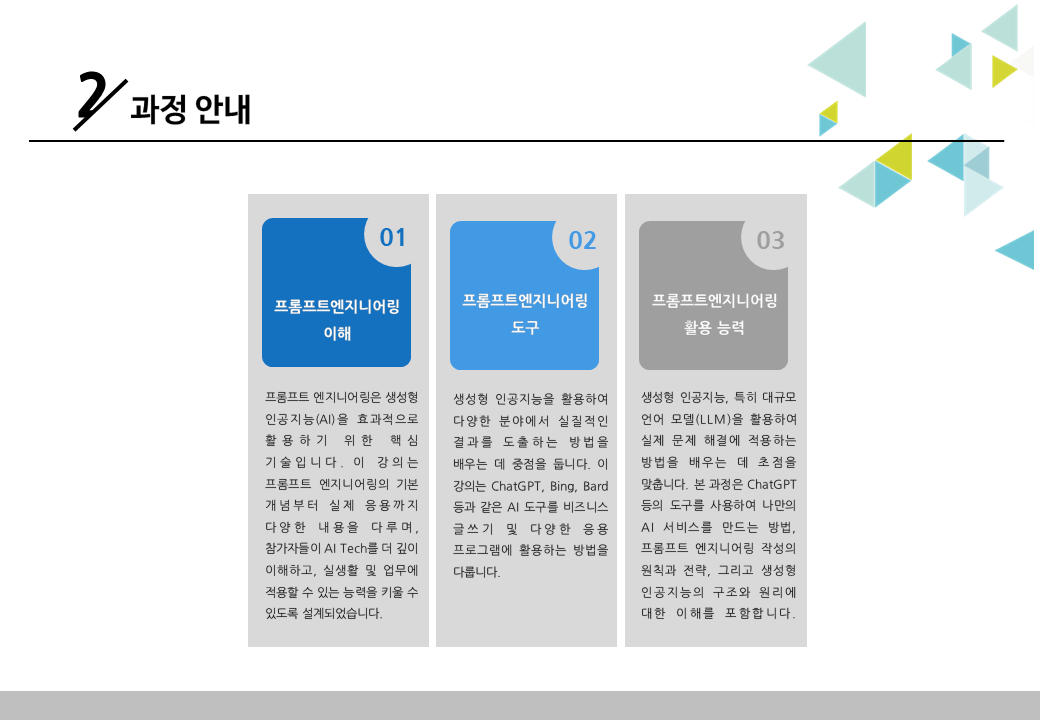 Chat GPT와 같은 생성형 인공지능 모델을 사용하여 다양한 작업을 수행하고 프로젝트를 구축하는 방법에 대한 교육으로 챗봇개발, 글 작성 보조, 문제해결 등 Chat GPT를 사용하여 다양한 작업을 수행하는 데 사용할 수 있는 프롬프트를 설계할 수 있도록 지원하는 과정입니다.