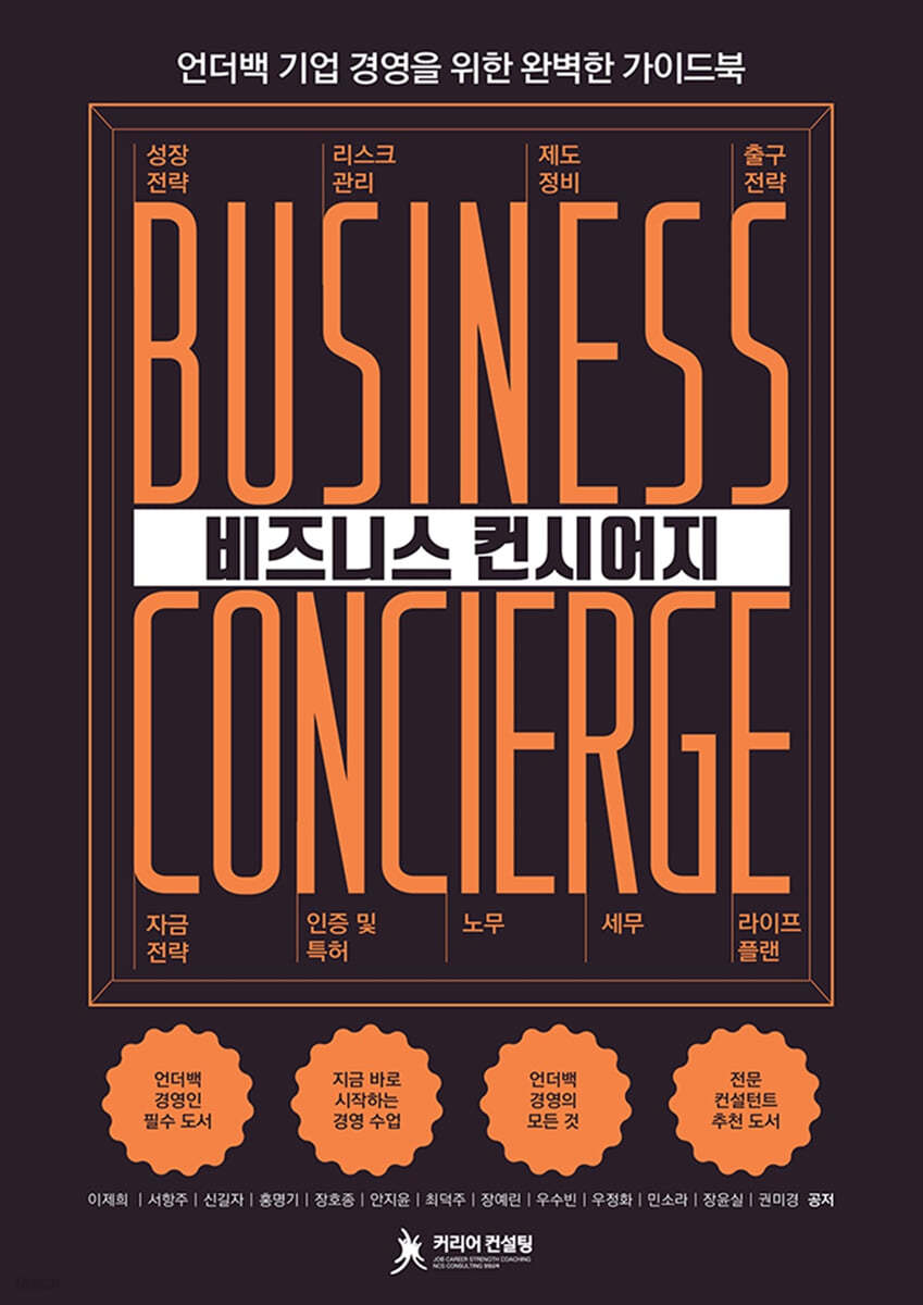 작은 기업일수록 급변하는 시장 환경과 치열한 경쟁에서 흔들릴 수 있다. 언더백 기업(직원 수 100명 이하)은 자원 부족과 복잡한 규제라는 현실적인 어려움에 직면해 있다. 하지만 빠른 의사결정과 유연한 대처 능력은 작은 기업만의 강점이다. 이 책은 언더백 기업이 강점을 살려 지속 가능한 성장을 이루도록 돕는 실질적인 가이드를 지원한다. 『비즈니스 컨시어지』는 실제 현장에서 바로 활용할 수 있는 실무 지침서이다. 리스크 관리, 성장전략, 제도 정비, 자금 전략, 인증 및 특허, 노무, 출구 전략, 세무, CEO 라이프 플랜 등 기업 경영에 필요한 정보와 노하우가 가득 담겨 있다. 13명의 저자가 파트별 유용한 정보와 흥미로운 사례를 소개해 마치 13권의 책을 읽는 것처럼 다양한 정보와 통찰을 제공해준다.