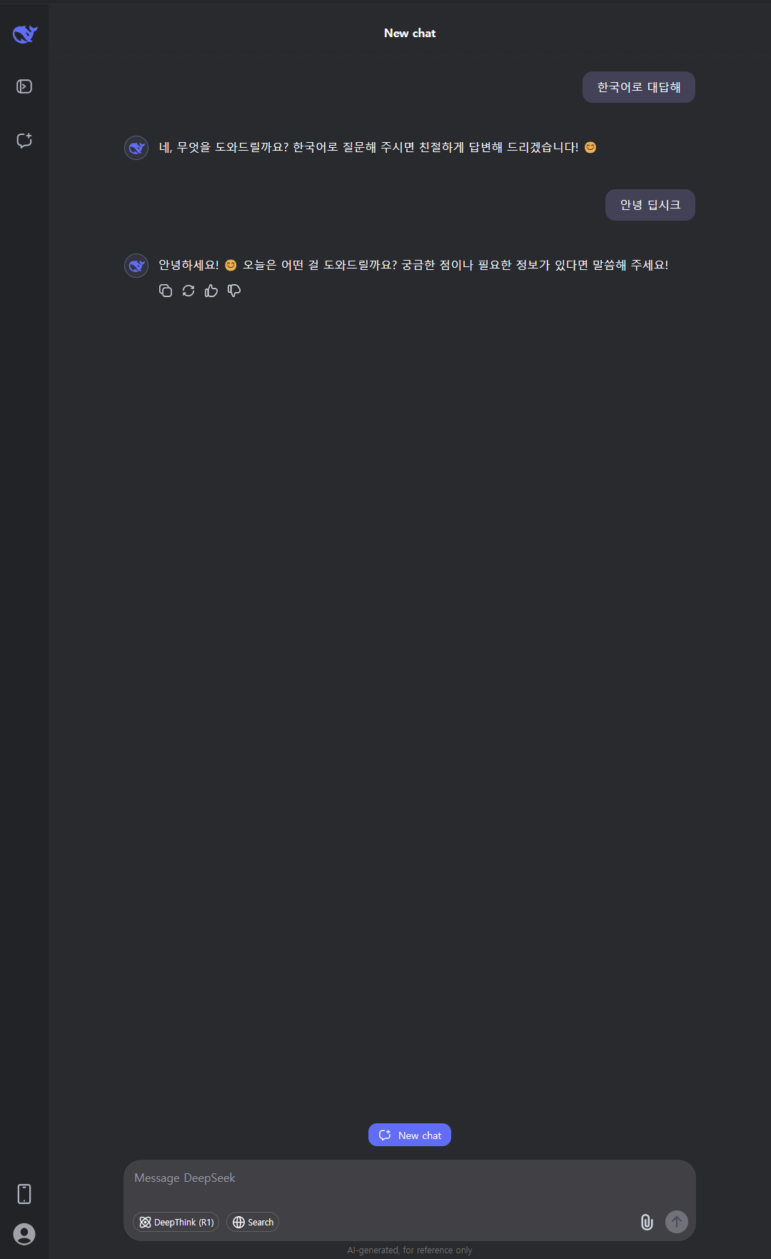 한국어까지 패치가 완료한 딥시크(Deepseek) 오늘부터 중국 딥시크 AI와 Open AI의 ChatGPT를 비교해 보며, 청중들에게 각 플랫폼의 장단점을 설명할 수 있는 강의자료를 만들어 봐야 겠다.