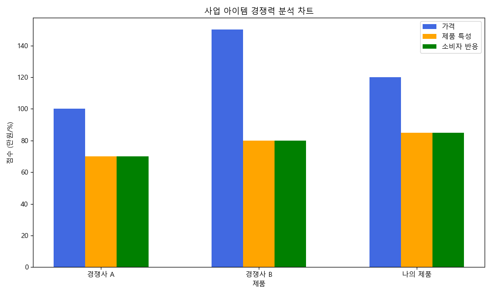 - 경쟁 분석: 경쟁사의 가격, 제품 라인업, 마케팅 전략 등을 AI가 분석하여 예비 창업자가 차별화된 경쟁 우위를 가질 수 있도록 돕습니다.