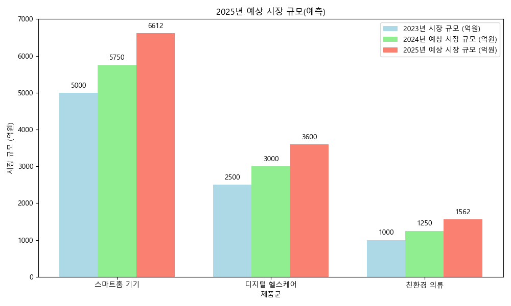 | 제품군 | 2023년 시장 규모 (억원) | 예상 성장률 (%) | 2025년 예상 시장 규모 (억원) |