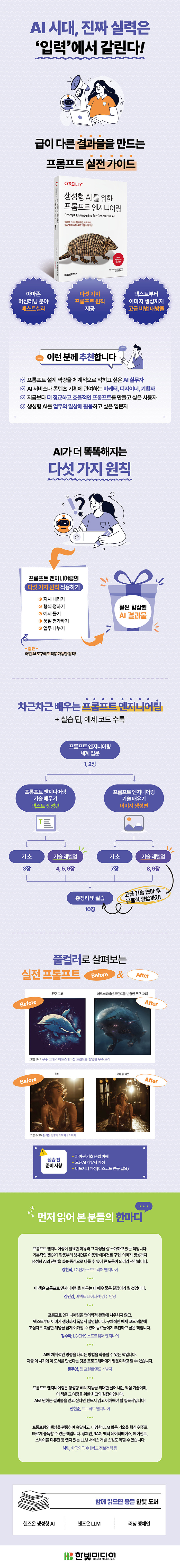 텍스트와 이미지 생성 프롬프트를 모두 아우르며 초심자는 체계적인 학습을, 실무자는 실제 프로젝트에 적용 가능한 전략을 익힐 수 있습니다. AI의 품질, 효율성, 신뢰성을 끌어올리고 싶은 실무자에게 가장 실용적인 실전 가이드가 될 것입니다.